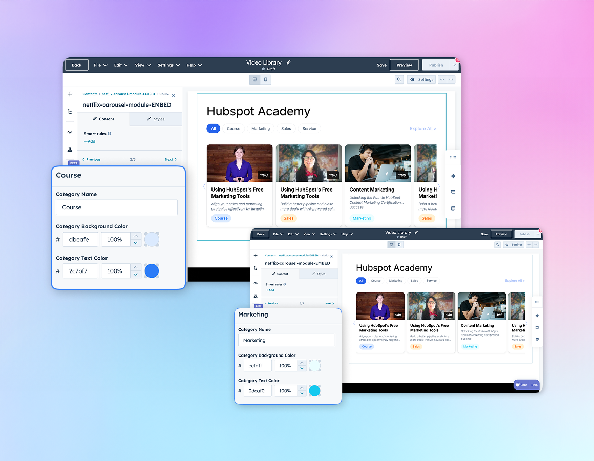 - Product Showcases: Display product demos, how-to videos, and customer testimonials organized by product line or category.